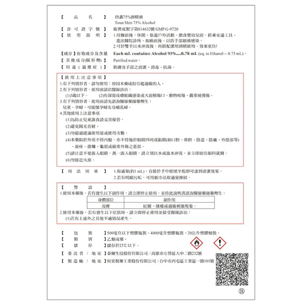 - 醫療器材許可證品名:唐鑫潔用酒精 75%