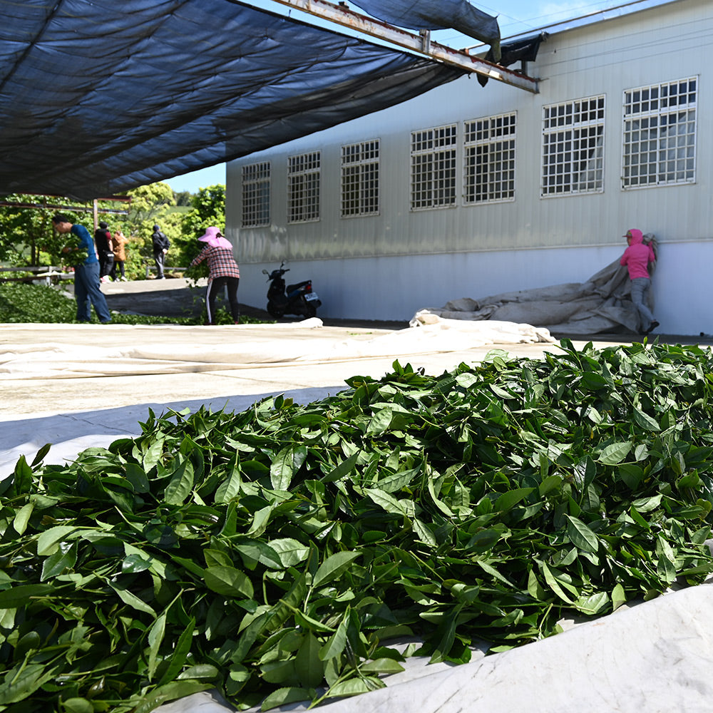茶葉的鮮甜、品質在這步驟真的非常重要!經過陽光曝曬下,既不能曬傷茶葉本體,且又要持續人工的巡視與翻動採下來的茶葉,80%的好滋味、在於這環節的細膩度!透過日光萎凋的茶葉,茶湯鮮甜!